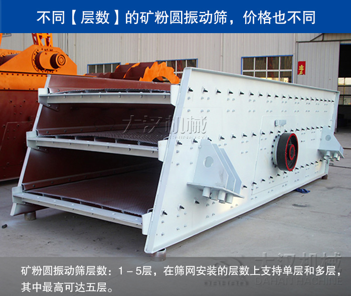 礦粉圓振動(dòng)篩層數(shù):1 - 5層,在篩網(wǎng)安裝的層數(shù)上支持單層和多層,其中層數(shù)可達(dá)五層。